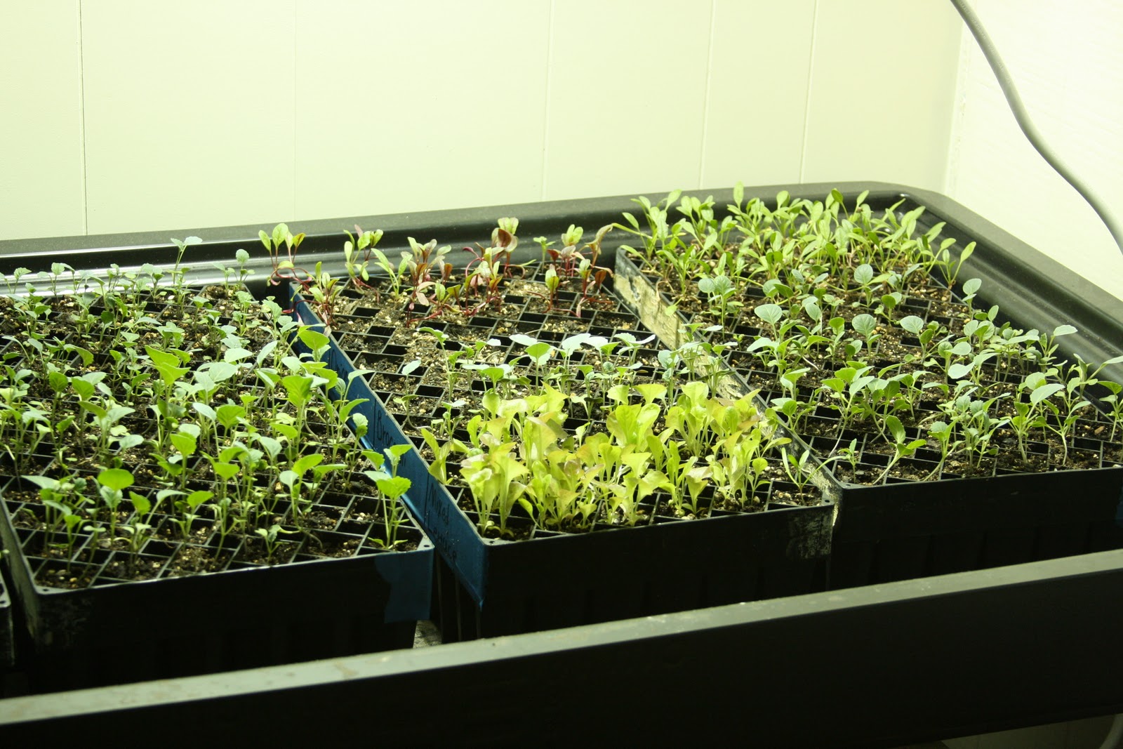 On January 23 we started 3 trays of seeds --36 collards, 36 kale, 24 cabbage, 24 spinach, 24 brussels sprouts, 18 lettuce mix, 18 broccoli, 18 onions, 18 chard.